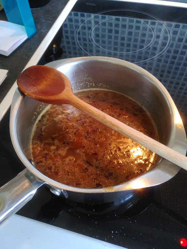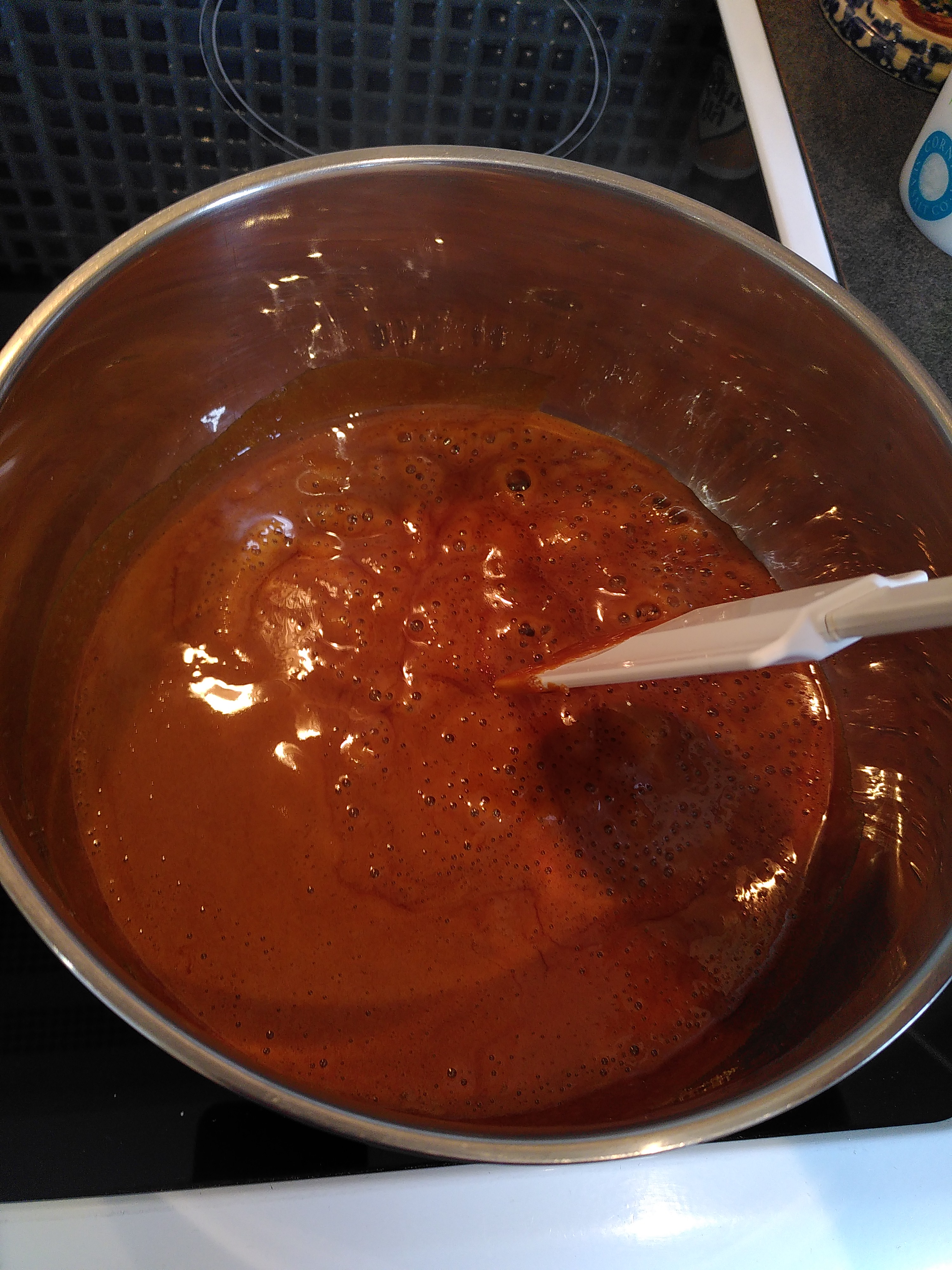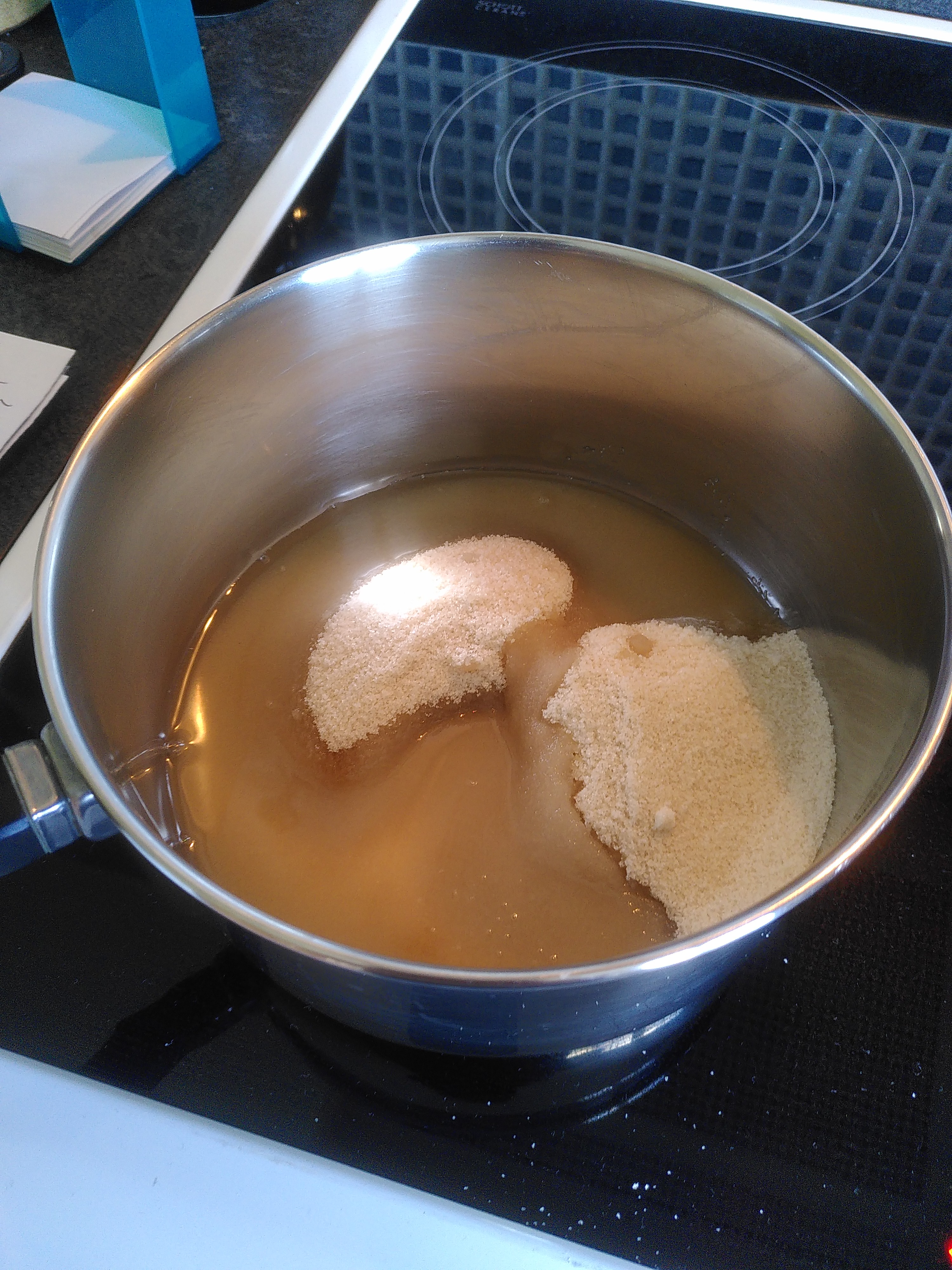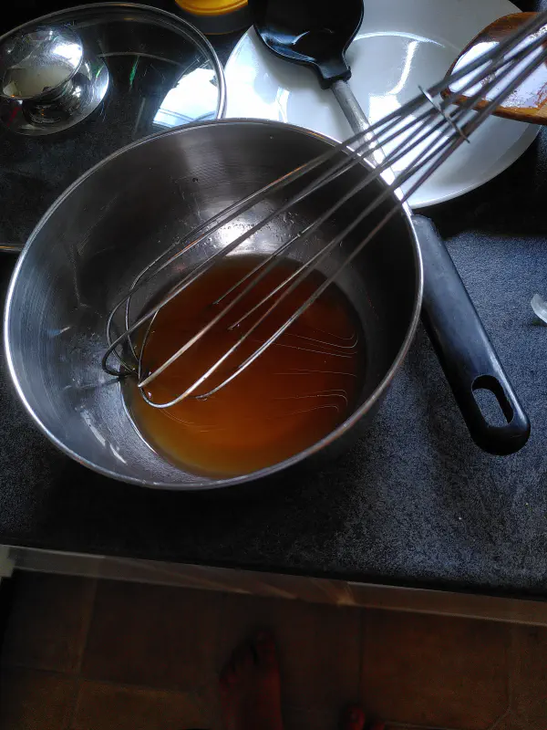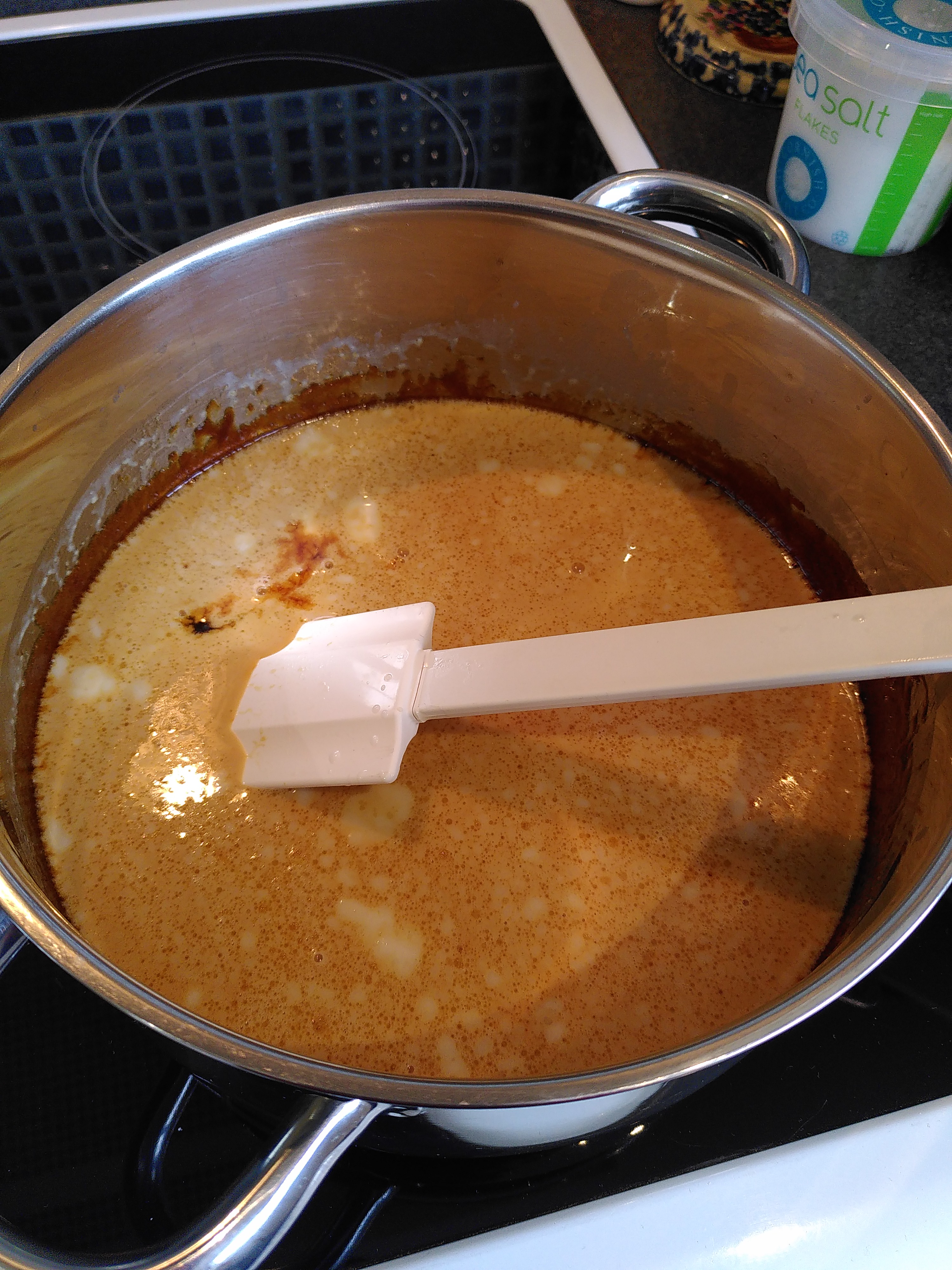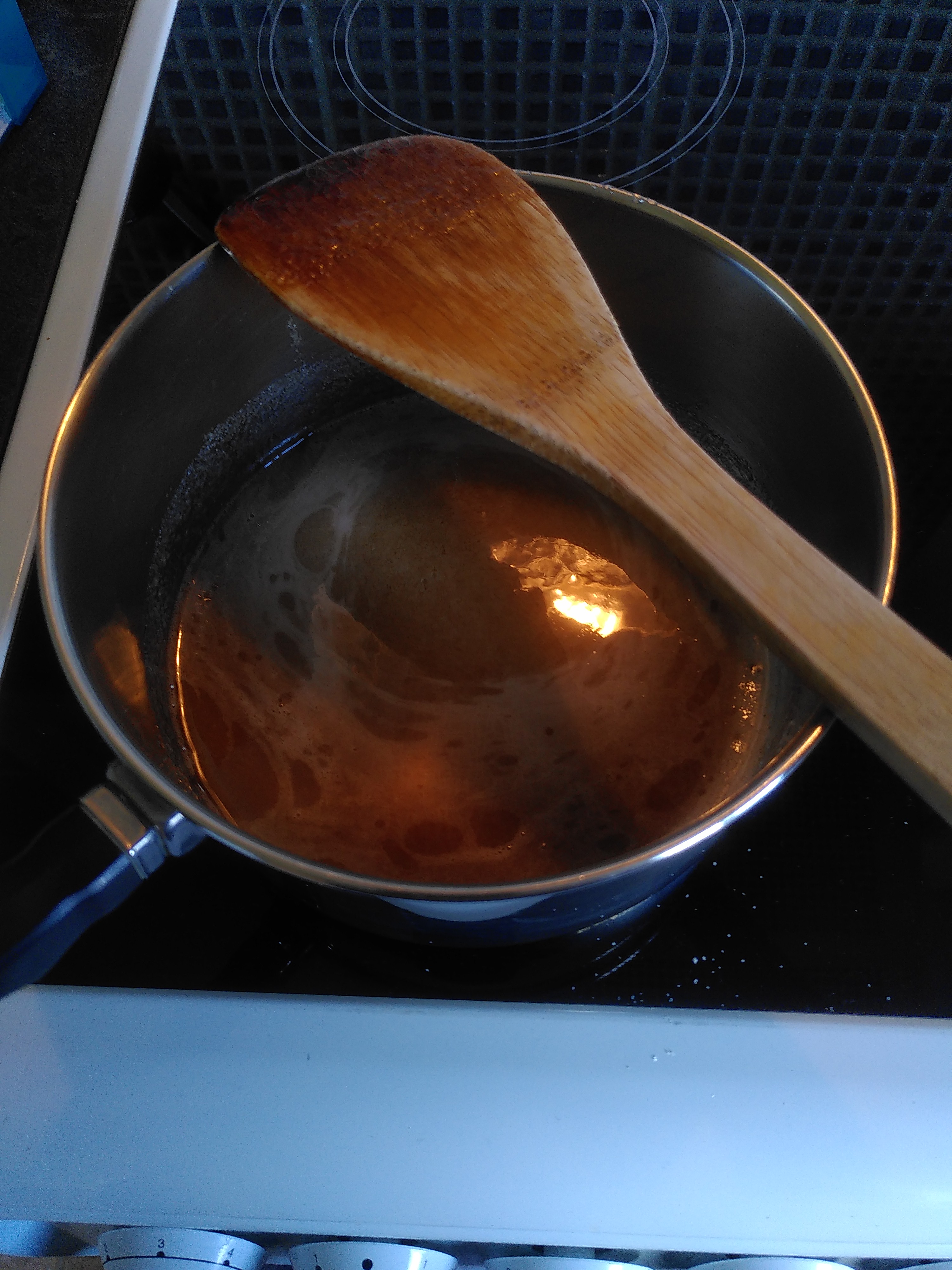 unappetising-looking sludge, as well as my hand (with a load of molten caramel,