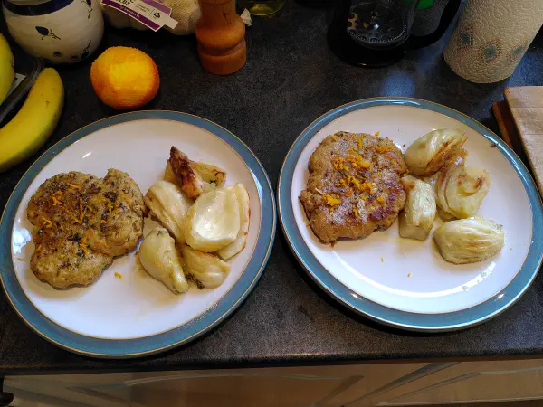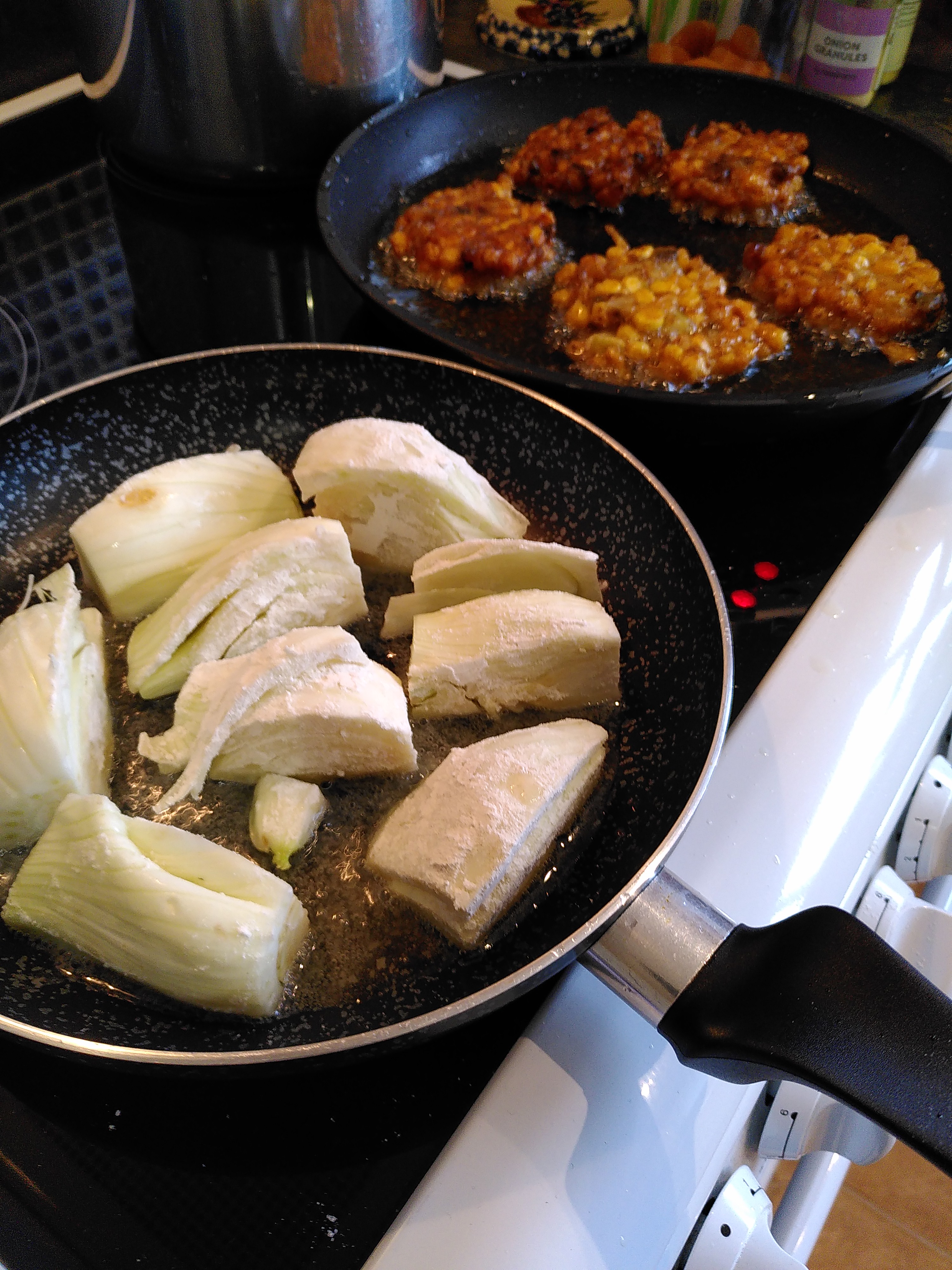 Pan-roasted pork tenderloin with garlic, coriander, thyme and braised fennel (and round 2 on the fritters!) ¶