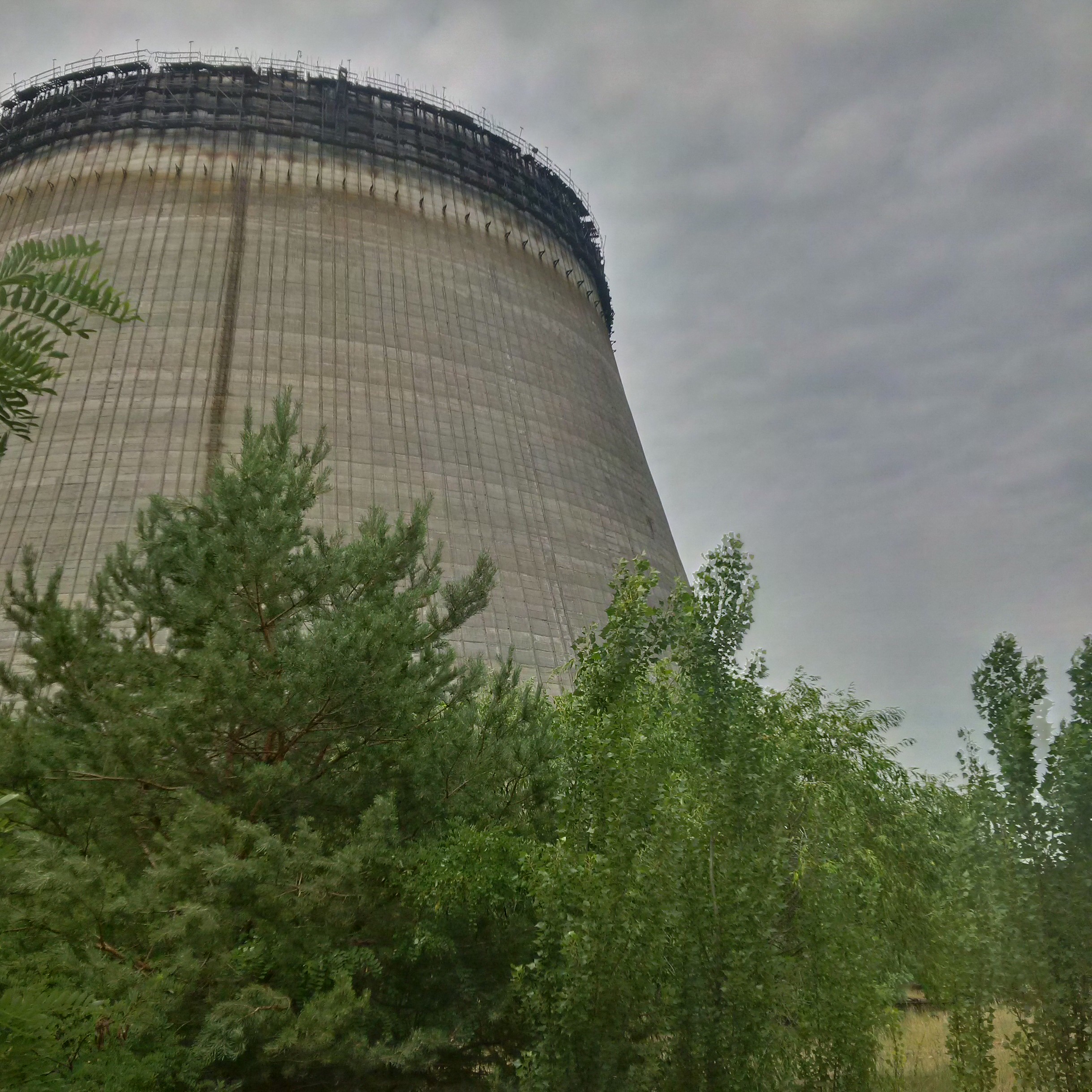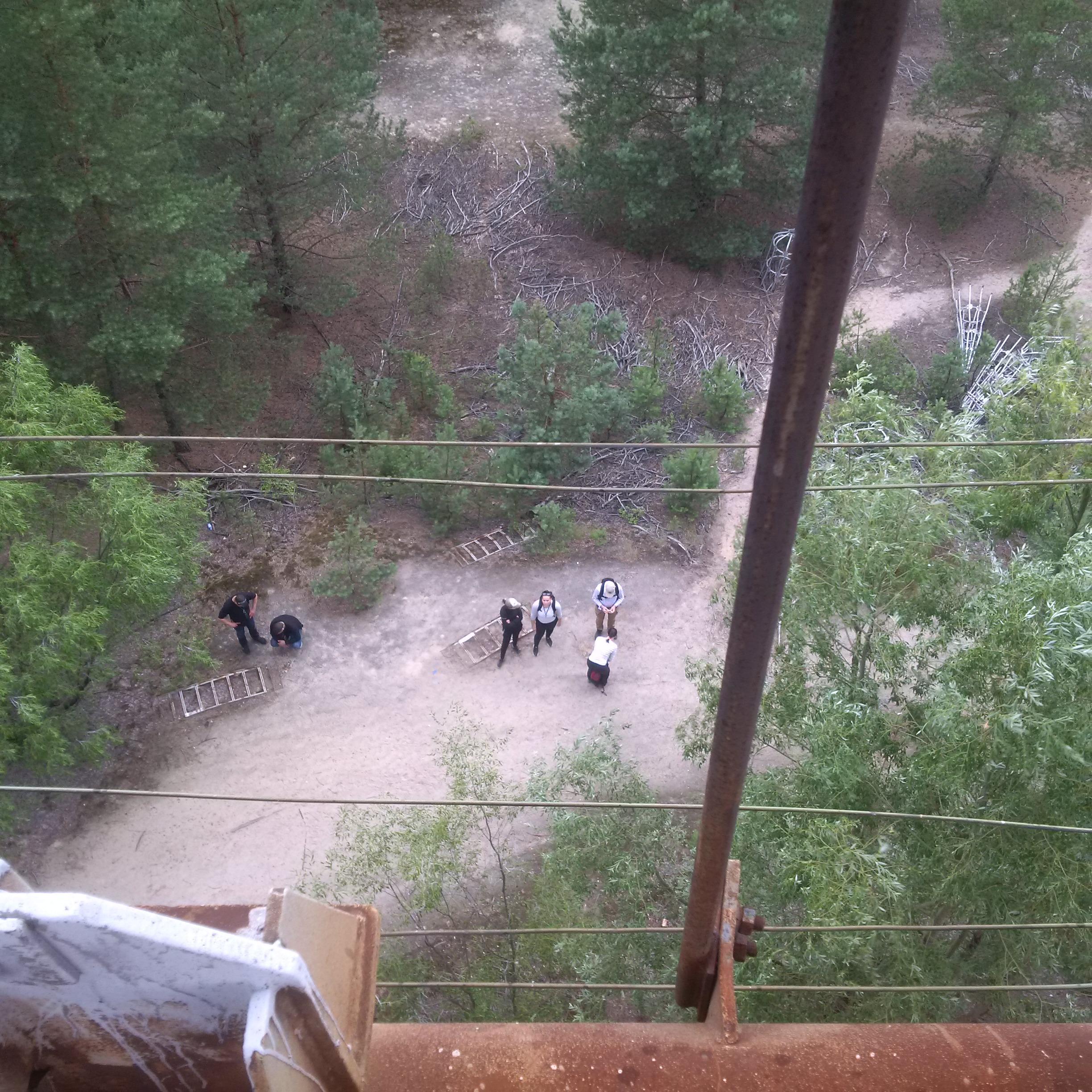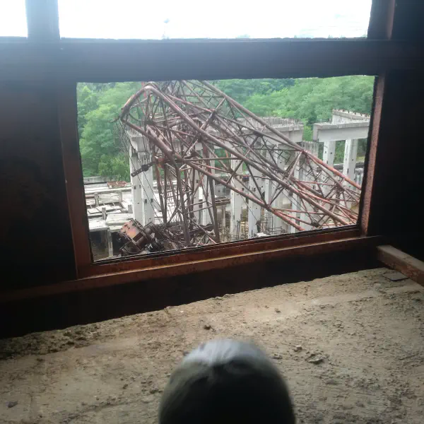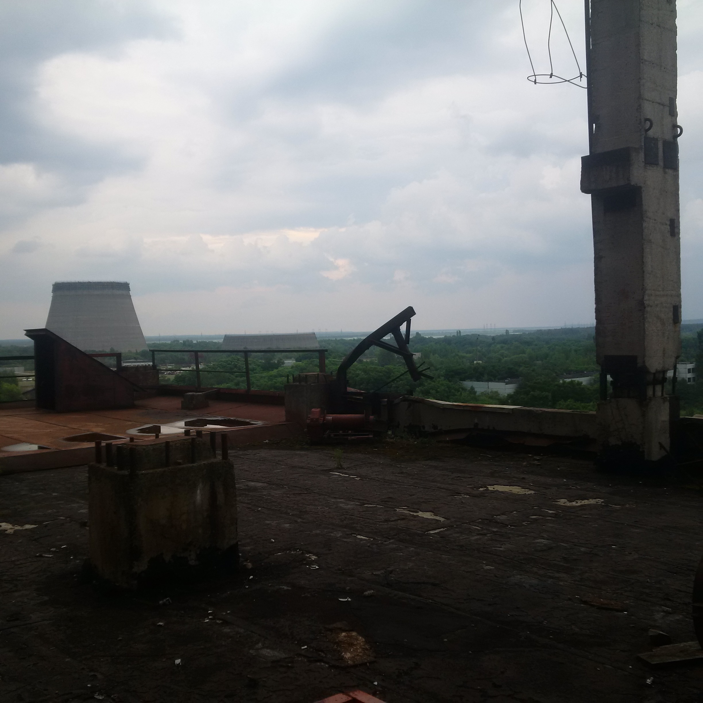 We walked along it and saw that all the lowest-level ladders had been removed because a Belarussian stalker [i.e.. an illegal Zone explorer] fell and died a few years ago. As we got to the end, our guide pointed to the remaining ladder: they missed that one. Cue the bolder of us clambering up, although as I popped my head over the ladder about 8 storeys up and noticed the walkway there slanted about 40 ° sideways, coinciding with a clap of thunder and the coming of rain, we decided to call it quits there: