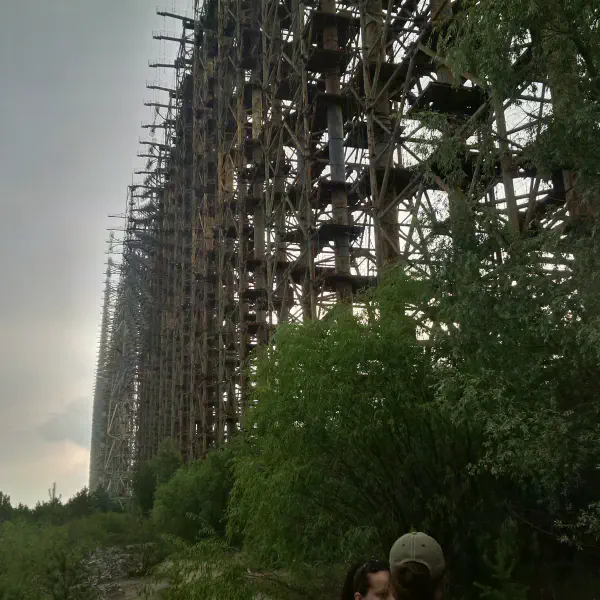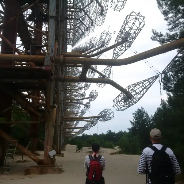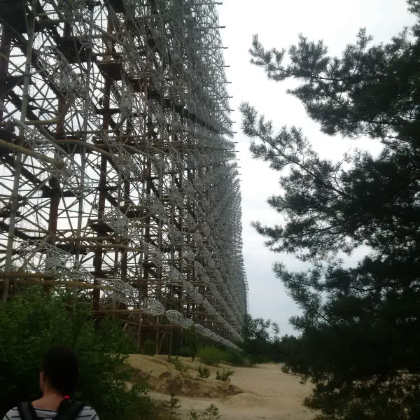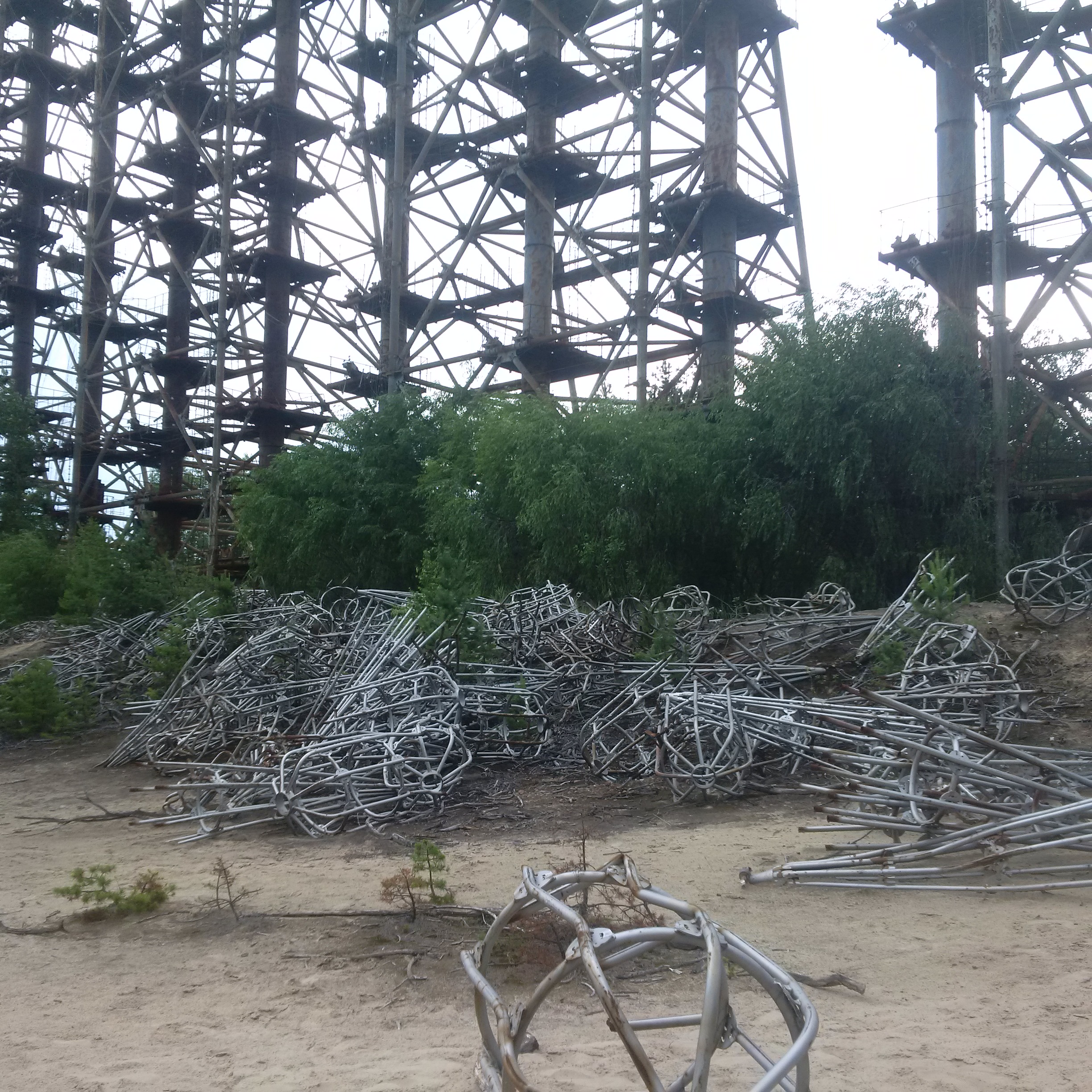 Ukrainians don’t believe in certain types of food only being appropriate to certain times of day, so we had carbonara for breakfast and headed out early to the Chernobyl-2 secret military establishment, which housed the 50-storey, 1 km-long Duga-1 radar installation. The entrance to the road to Chernobyl-2 was disguised as a children’s summer camp, but it’s rather harder to hide a big sod-off metal thing that can be seen for miles around, so the Soviets just said it was a TV antenna and anyone who didn’t fancy a visit from the KGB nodded along.
