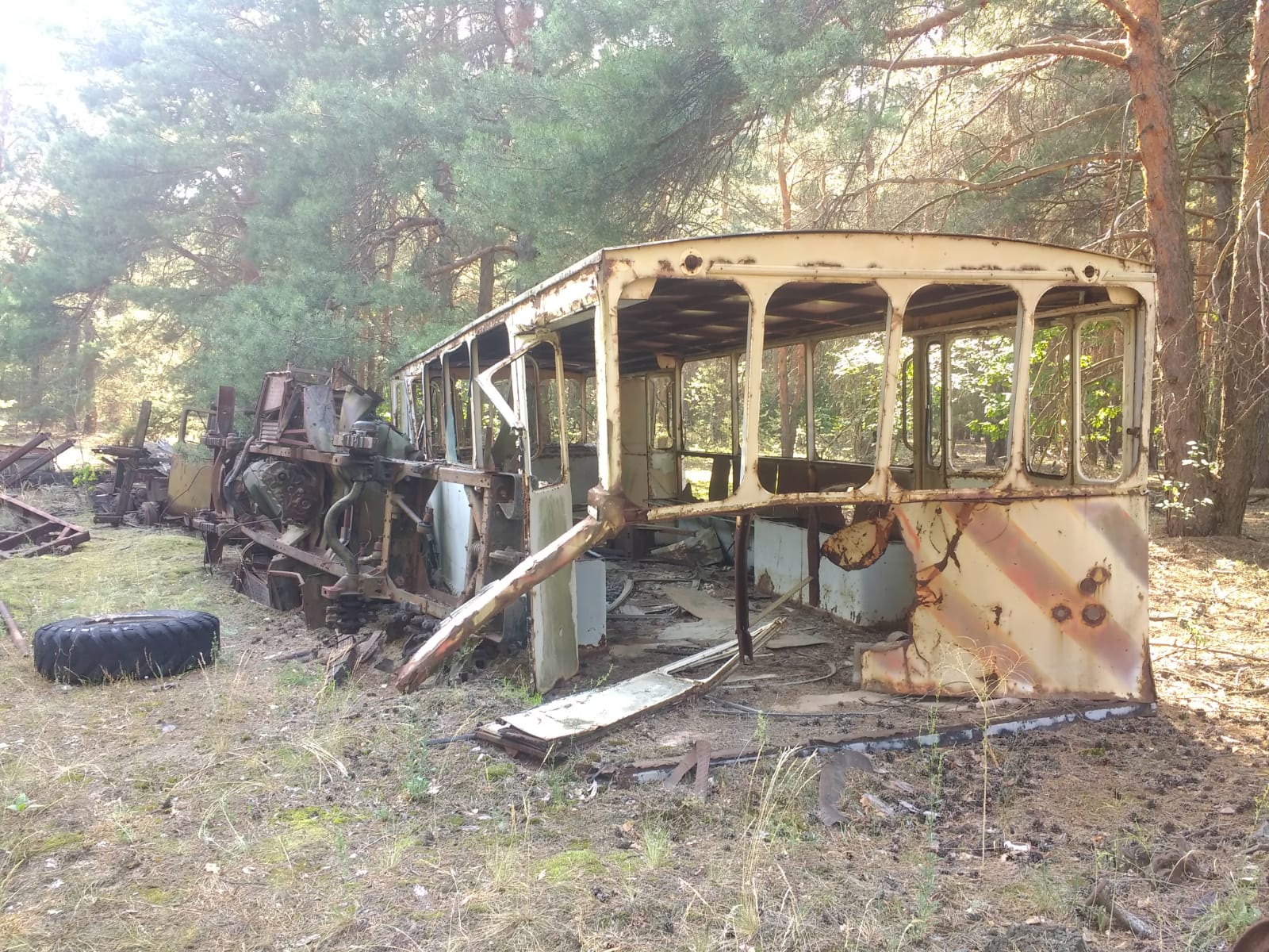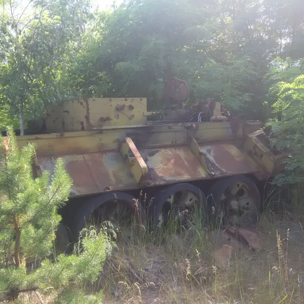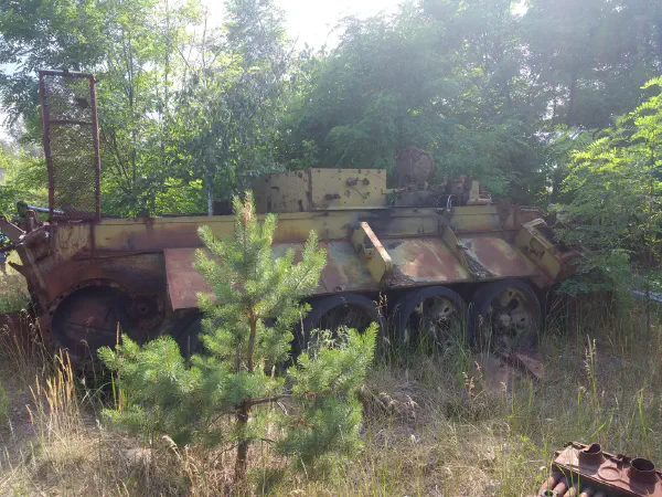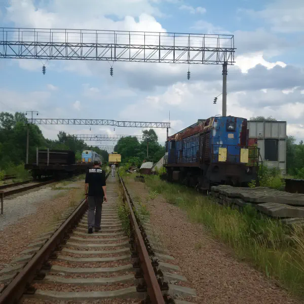 At this point we were getting very sick of all the pickle and dill in Ukrainian cuisine, but we were getting to know our group better the longer we spent together. There was: the two of us; couples from Czechia, Britain and Poland; a Ukrainian; a clueless Chinese woman (who kept leaning her dosimeter against radiation hotspots in order to better take a photo, then picking it up and walking off again without even giving it a wipe, who announced as we got onto the minibus after Duga-1 that she had left her dosimeter behind and who at one point zipped off the bottom part of her trousers and was waltzing around in shorts—a big no-no in the Zone—because she thought the tour was over); and an American bellend who would routinely get lost and who, after being told at a train station that we could get up onto the trains as long as we did it on the side that the guard couldn’t see, promptly climbed up the guard’s side of the train, and then onto the bloody roof.
