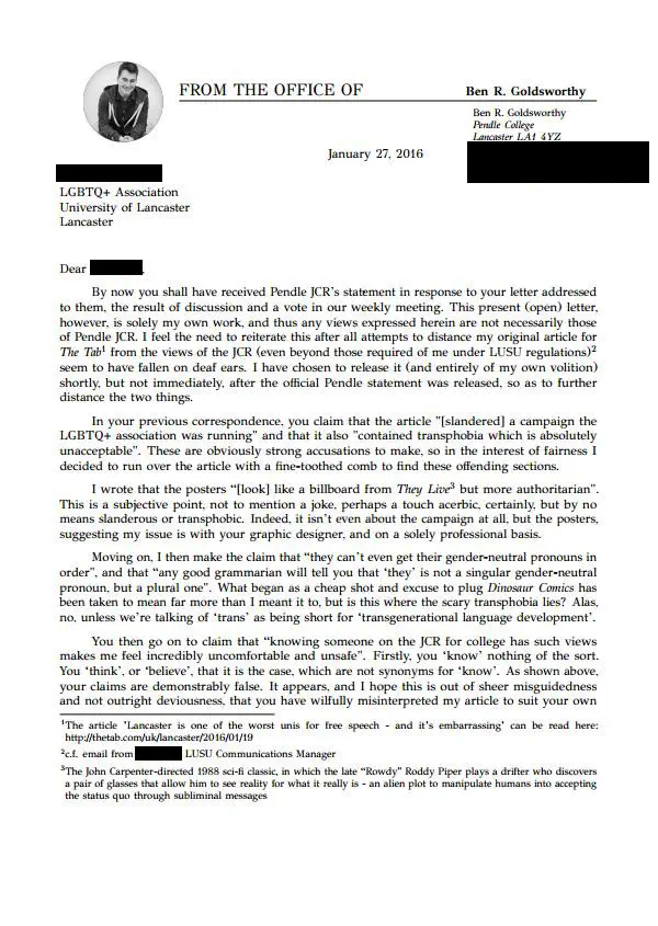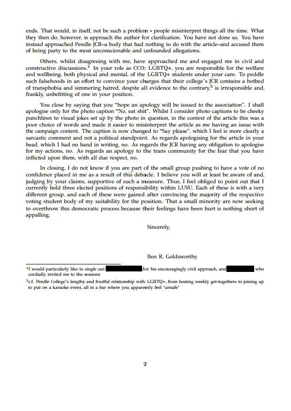 The following week, things kicked up a notch. The CCO: LGBTQ+ at the time sent a letter to the Pendle College JCR Exec., of which I was a member, via our then-VP (Welfare).6 The undated letter stated that a member of [the] JCR7 wrote an article slandering a campaign the LGBTQ+ association was running [and which] also contained transphobia. The letter went on to state that the CCO, who was also a trans student and a member of Pendle college, felt that knowing someone on the JCR for college has such views [made them] feel incredibly uncomfortable and unsafe.