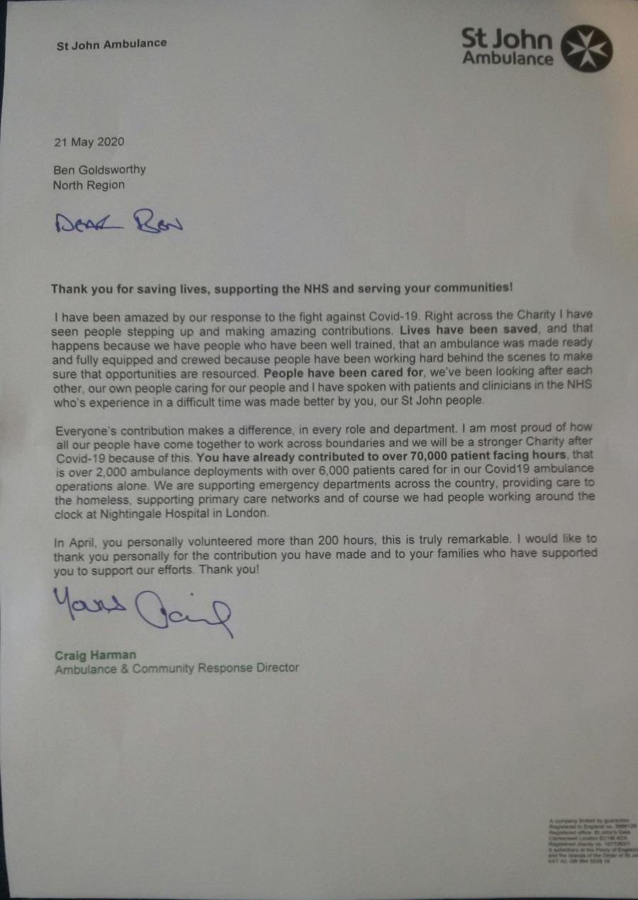 Letter of commendation from Ambulance & Community Response Director/COVID-19 National Tactical Commander